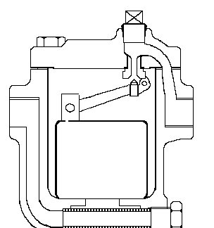 倒吊桶式疏水閥內(nèi)部是一個(gè)倒吊桶為液位敏感件,吊桶開(kāi)口向下,倒吊桶連接杠桿帶動(dòng)閥心開(kāi)閉閥門(mén)。倒吊桶式疏水閥能排空氣,不怕水擊,抗污性能好。過(guò)冷度小,漏汽率小于3%,最大背壓率為75%,連接件比較多,靈敏度不如自由浮球式疏水閥。因倒吊桶式疏水閥是靠蒸汽向上浮力關(guān)閉閥門(mén),工作壓差小于0.1MPA時(shí),不適合選用。