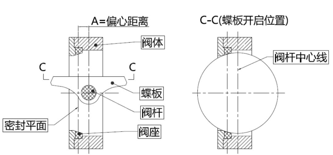 蝶板的閥桿中心與蝶板密封截面按A偏心設(shè)計(jì),蝶閥在開(kāi)啟過(guò)程中,蝶板密封面逐漸脫離閥座密封面;