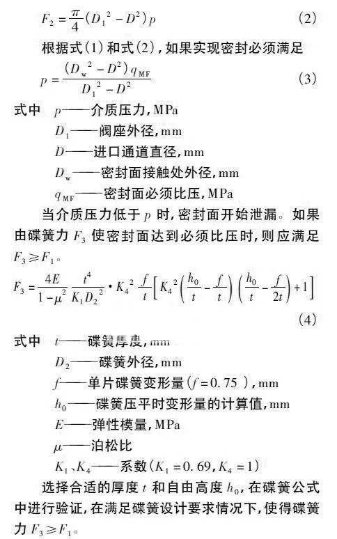 (1) 密封預(yù)緊力。通過螺栓產(chǎn)生一定的預(yù)緊力,再由閥座壓蓋傳遞給碟簧,使得碟簧產(chǎn)生變形。為了延長碟簧使用壽命,碟簧的變形量不能超過自由高度的75%,通過系列力的傳遞使密封副達(dá)到設(shè)計的密封比壓。